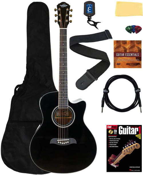 Oscar Schmidt OA10CE Mini Auditorium Acoustic-Electric Guitar - Black Bundle with Gig Bag, Cable, Tuner, Strap, Picks, Instructional Book, DVD, and Austin Bazaar Polishing Cloth